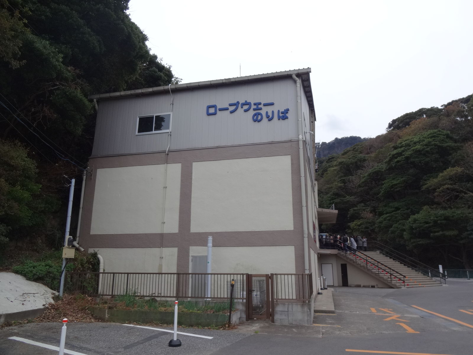 とりあえず山麓駅に到着。ちょっと坂を登ったあたりにひっそりとコンクリートの建物があるのは、ロープウェイ業界のトレンドだったりするのでしょうか?交走式ってのも。